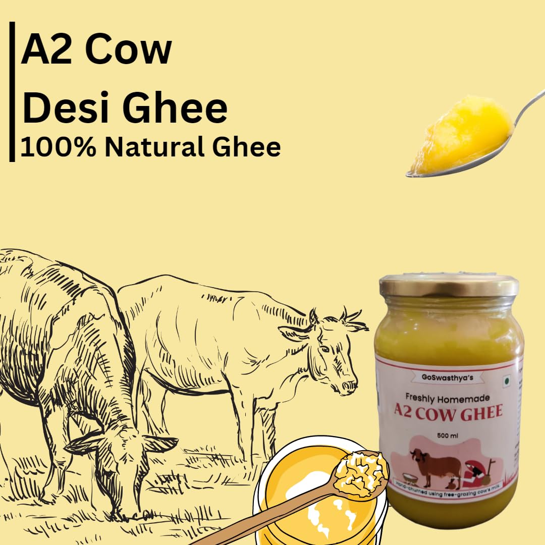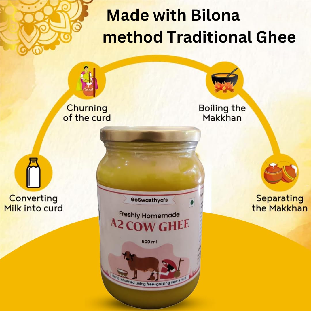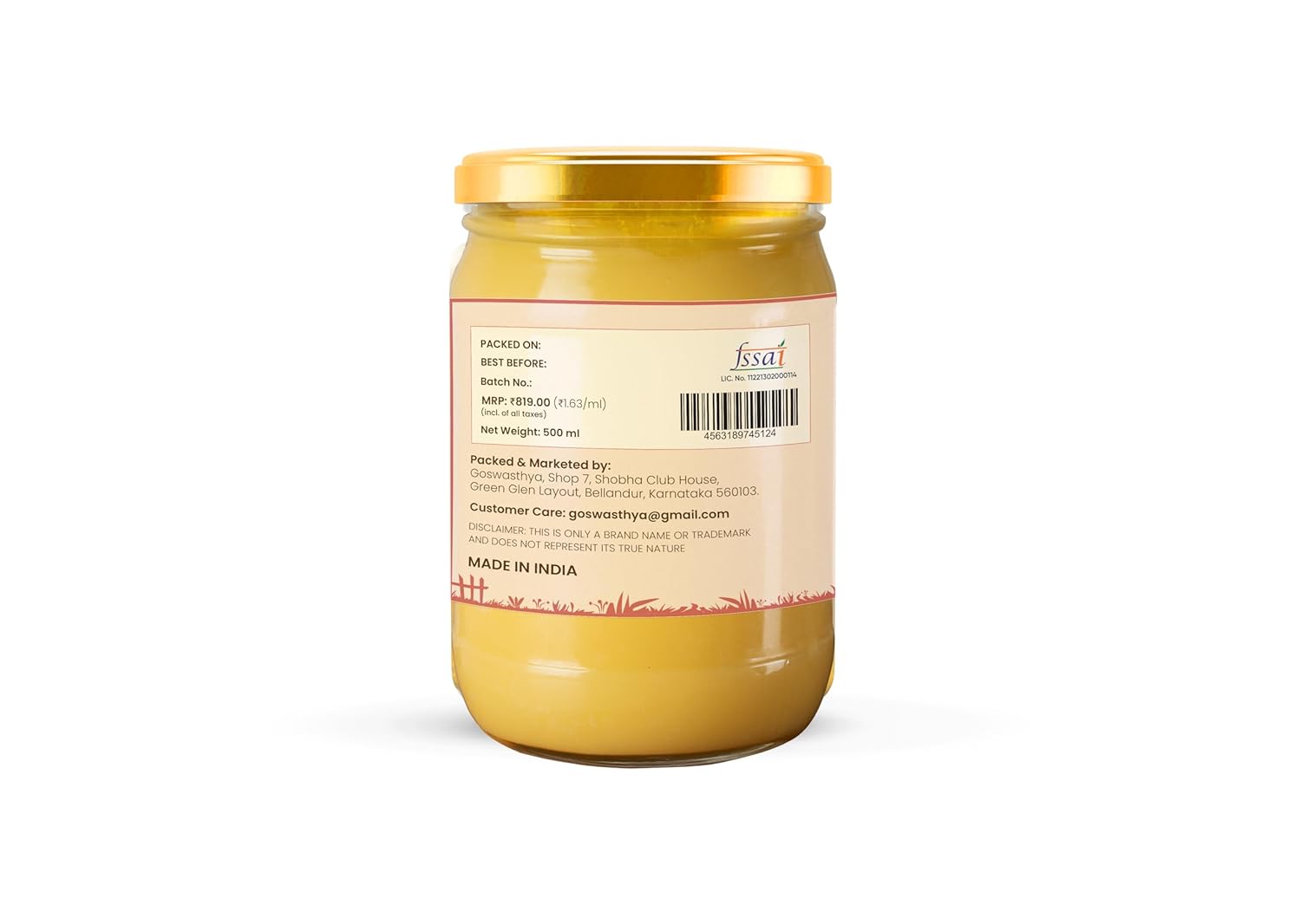 GOSWASTHYA A2 Cow Desi Ghee|Curd-Churned| 100% Natural Ghee | Made with Bilona method |Traditional Ghee | Glass Jar (500ml)